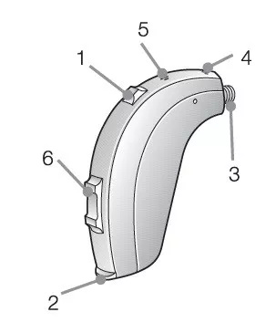 6. 音量钮*:音量控制可用来增加或降低助听器的音量:(1)向上按音量钮,增加音量(2)向下按音量钮,降低音量