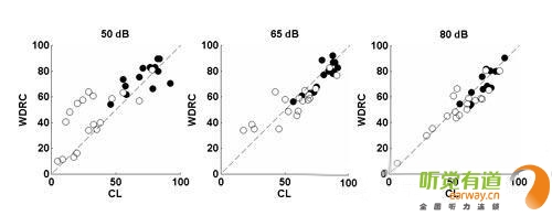 如下图,白点是重度听力损失患者的辅音识别得分,黑点是轻度至中度听损患者的辅音识别得分;每位受试者佩戴四通道的耳背机,验配采用 NAL 公式;测试言语声强度分别为 50dB SPL、65dB SPL 和 80dB SPL;比较 WDRC 和线性输出压缩限制(CL)两种线路的得分。