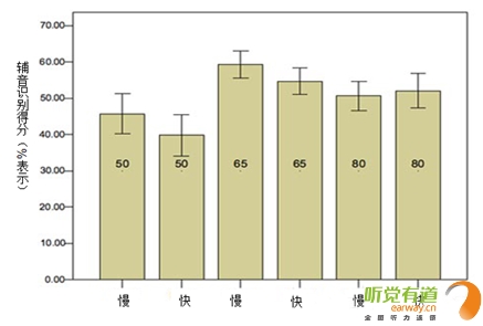 上图为一组重度听力损失患者选配快速和慢速 WDRC 线路的言语识别率对比。在输入声级为 50 和 65 dB SPL 时,快反应压缩线路的受试者得分明显比慢反应压缩线路的受试者差;在 80 dB SPL 输入声级下则并无明显差别。