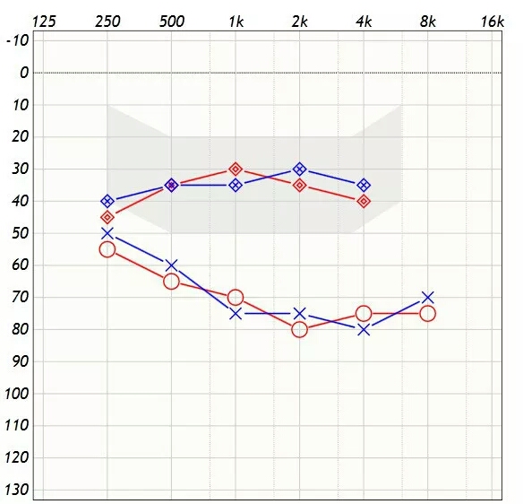 什么是助听听阈?简单一句话,人耳佩戴助听装置(助听器、人工耳蜗等)后能听到的最小声音强度就是助听听阈。我们都知道没有带助听器时做听力检测(纯音测听,通常佩戴压耳式耳机测试),可以获得得一个图一所示的听力图(气骨导阈值),称为裸耳听阈。
