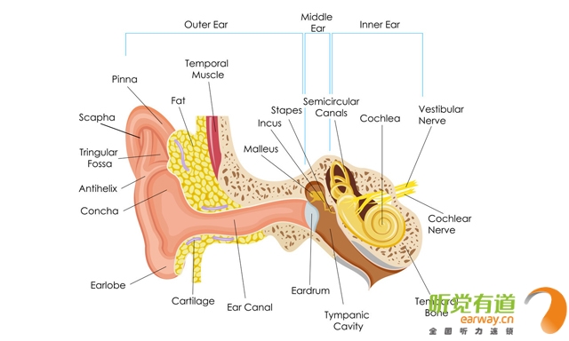 人的听觉系统以耳蜗为中心,外在的声音经外耳道传入,震动鼓膜和听小骨,再引起淋巴液、基底膜震动,刺激内耳螺旋器的毛细胞,产生听觉,毛细胞把声音信号转为神经冲动,传入听神经至听觉中枢完成听觉。在整个听觉过程中任何环节的病变均可以引起听力障碍。