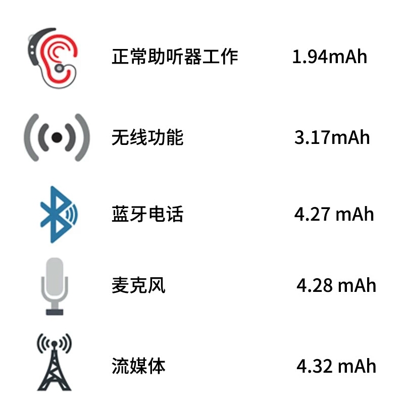 按照耗电量从小到大排列,下图列出了部分助听器先进功能对于电量的需求(毫安时)。可以看到,与简单工作相比,使用先进功能的耗电量急剧上升。所以,如果您使用了助听器的无线功能,那么电池使用寿命当然会比助听器仅简单工作时要短很多。