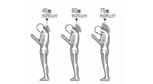 研究数据表示,当人在低头45度时,颈椎就得担当起22公斤的“大任”;当头低到60度的时候,你的颈椎则要承受25公斤的重量。这可不是个小数目,它甚至已经超过了7岁小孩的平均体重。