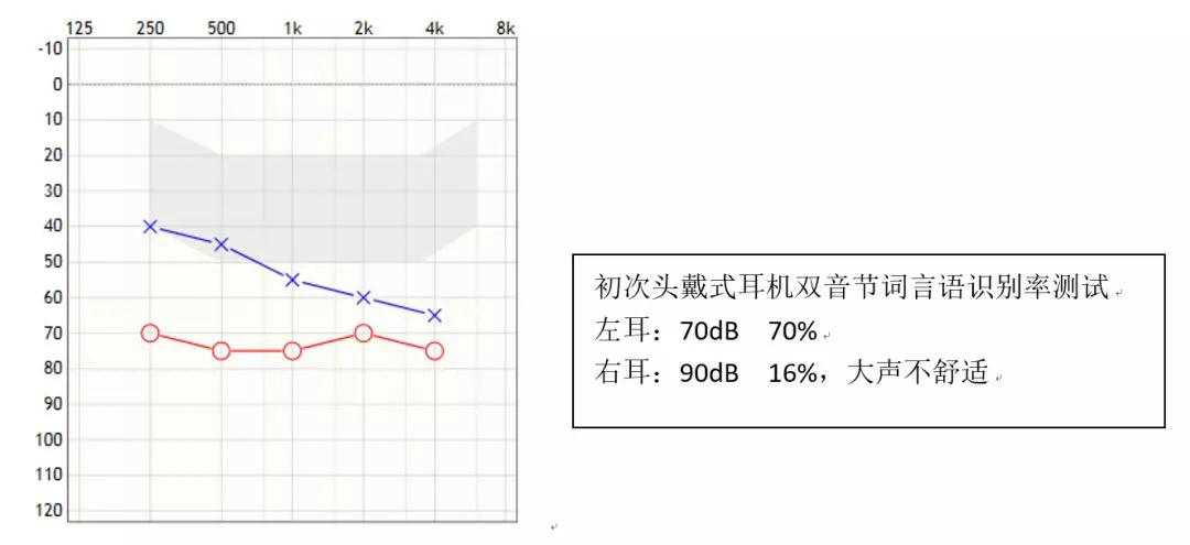 这是一例典型的非对称性听力损失案例。从听力康复的基础资料来看,虽然右耳突发性听损遗留重度听力损失和非常差的言语识别率,幸运的是左耳虽然听力损失时间长,但程度较轻,言语识别率测试结果也较好,因此对于未来的康复效果也有较好的预期。