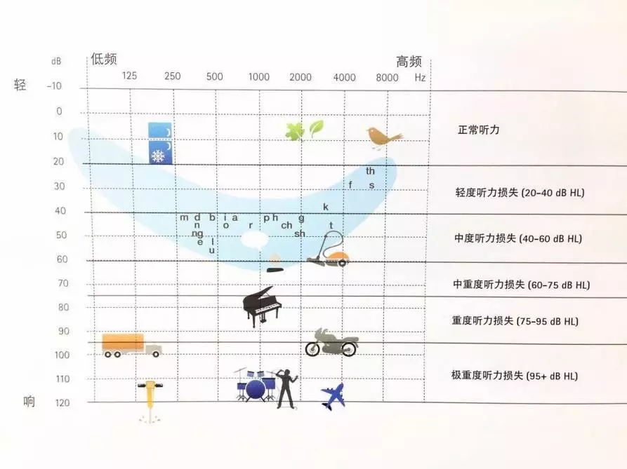 从上图可以看出平均听力在26-40分贝属于轻度的听力损失,由于正常的语言交流在50分贝左右,所以大部分轻度听力损失患者感觉日常交流没有问题,只是听不到一些小声讲话或者远距离的声音。