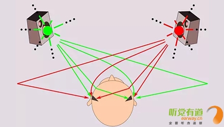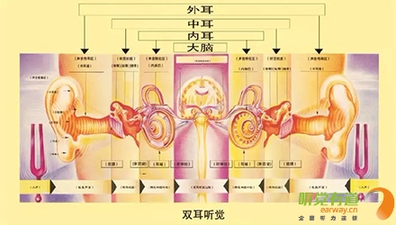 声音到达两侧耳所经历的路径是不同的。信息的交叉与混合出现于相对低级别的听觉系统。大脑利用双耳间的时间差、强度差、频率差和相位差来区别各种声音。虽然声音来自两侧,但正常听力的人们会感受到单一的整体声音。