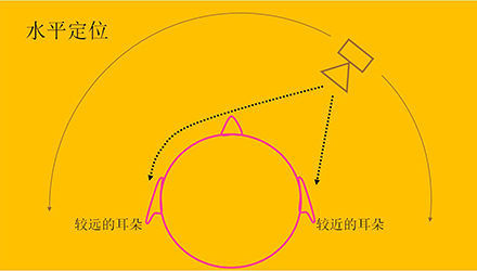 水平定位:是根据到达双耳声音的时间和强度不同实现的。声波先到达离声源近的一侧耳(近耳),然后才到达离声源远的一侧耳(远耳),声音到达两耳会有时间差,我们称为耳间时差。例如,声源在正前方时耳间时差为0 ms,声源在离正前方90°角的位置时耳间时差最大,约为0.7 ms。