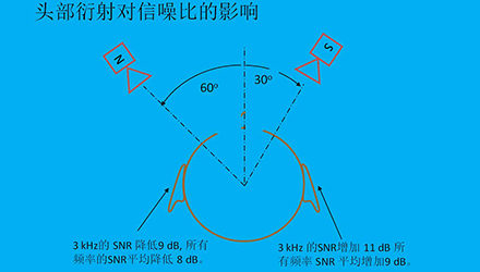 例如,如果信号在正前方偏右30º,噪音在正前方偏左60º,那么在右耳的平均信噪比增加量为9dB,而在左耳,平均信噪比增加量为-8db,也就是说右耳的信噪比比无衍射效应时增加了9dB,比左耳信噪比多17dB。