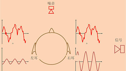 双耳交叉抑制:假设噪音从正前方传来,到达双耳的振幅和相位相同,纯音信号从右侧传来,因此纯音到达右耳的振幅比左耳大,如果大脑将右耳接受的总声波减去左耳的总声波,结果噪音的声波就被完全解除了,剩下的声波形态应该与右耳波形类似。