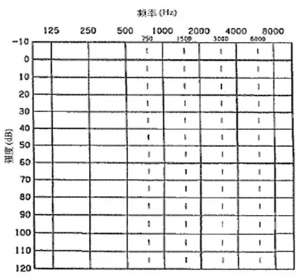 纯音测试听力图的横坐标为频率,从左至右表示测试声的频率从低到高,即125Hz至8000Hz;纵坐标为强度,从上至下表示受试者能听到的最小的声音强度,以dBHL为单位。如下图所示: