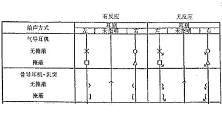 听力图的画法自从1943年在C.C.Bunch的著作中出现后,至今没有改变。通常右耳的测试结果用红色表示,左耳用蓝色。下图是ASHA(1990)建议使用的各种标记符号,这些符号已在世界各地广泛使用。