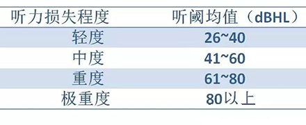 按照世界卫生组织(WHO)1997年的标准,根据0.5kHz、1kHz、2kHz、和4kHz气导平均听阈值,将听力损失分为轻度、中度、重度和极重度。