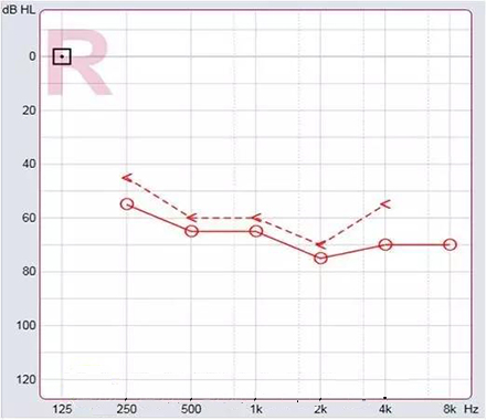 在助听器调试过程中,不能忽视听力图的作用。举一实例:下图为某助听器佩戴者的听力图,经过多次降低高频增益,仍反应声音刺耳。通过对听力图的观察,该佩戴者2kHz处的听阈较高,且2kHz处的增益亦较多。将2kHz处的增益降低后,助听器佩戴者的满意度提高。