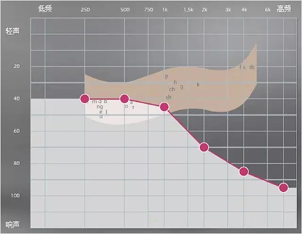 中文汉语元音辅音的频率及响度有其分布图,如下图所示。以陡降型听力曲线为例,该听力损失者听不到大部分的辅音。听得清不清楚,主要取决于高频辅音听得到听不到。例如该听力损失者“g”、“ch”听不到,但“u”能听到,因此,他会将“姑姑”、“出租”都听成“uu”。听不清楚时,再结合口型,前后句的冗余度猜测。猜对则谈话继续,猜错则打岔。儿童听力曲线若是如此,长期接收不正确的语音,会出现口齿不清。