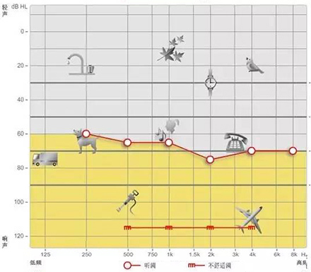 小声听不到,大声受不了是重振现象。以下图听力曲线为例,“飞机”处于不舒适阈附近,听力损失者对“飞机”的声音听着受不了。另外,该听力损失者听不到“手表”等声音。