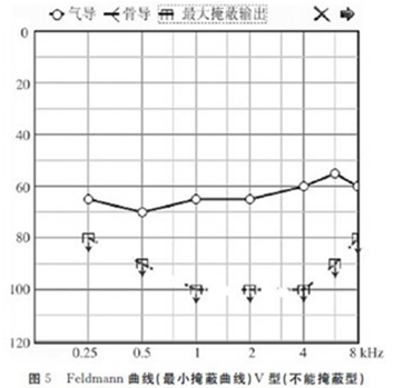 Feldmann将耳鸣掩蔽曲线分为五型,即合聚型(图1)、分离型(图2)、重迭型(图3)、间距型(图4)及不能掩蔽型(即最大输出掩蔽声不能掩蔽住耳鸣)(图5)