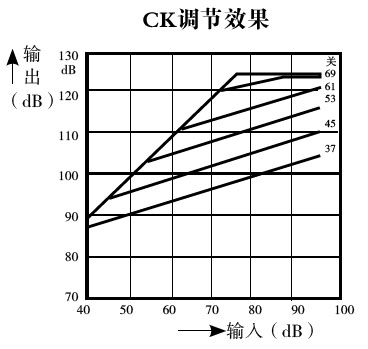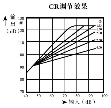 4)CK—压缩拐点/CR——压缩比:是压缩线路独有的微调。自动增益压缩控制(AGC)是一种反馈装置,能自动降低助听器的增益而不引起失真,从而限制助听器输出。一旦自动增益压缩控制起作用,在输入和输出之间就会建立起新的线性关系。压缩拐点是压缩起效所需要的最小输入声压级,拐点设置得越高,助听器就越接近线性放大;压缩比为压缩启动后,输入变化量与输出变化量之比,压缩比的绝对值越大,表明增益越小,当压缩比等于1:1时表示线性放大。