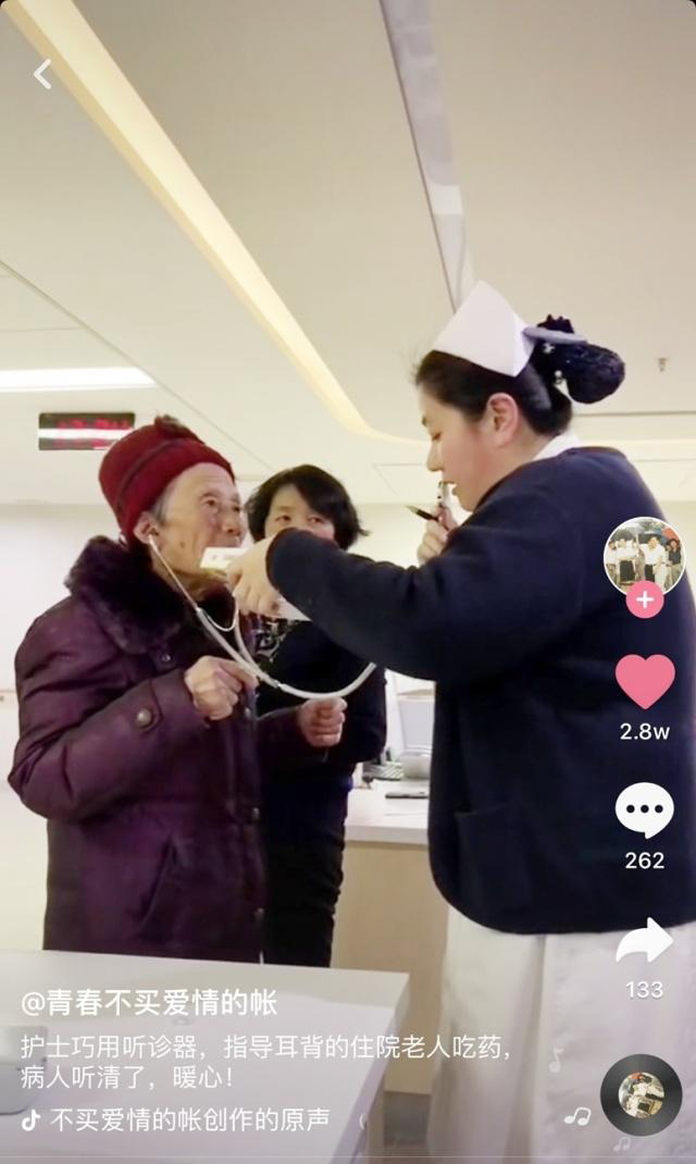 友好医院工作人员把这段视频做成一条抖音视频,以网名“青春不买爱情的帐”发送。“青春不买爱情的帐”说,本来就想与同事和朋友分享一下医院护士既机智又暖心的行为,没想到仅一天的工夫,竟获百万点击量,数万个赞。