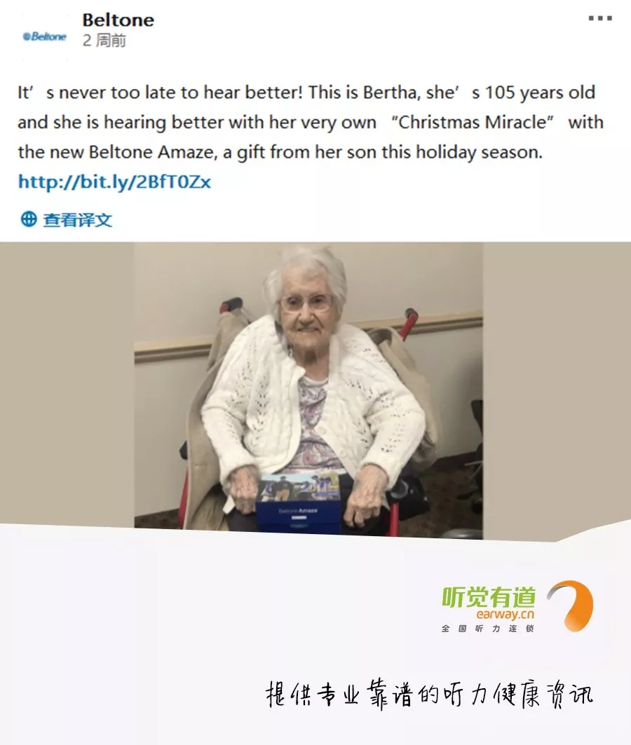 在美国,有一位叫做Bertha的老奶奶,去年她就已经105岁了。去年圣诞,她的儿子带她配了一台美国贝尔通助听器,作为圣诞礼物。
