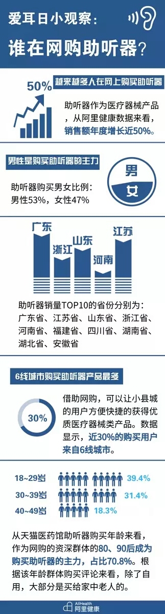 阿里巴巴旗下阿里健康发布了在淘宝、天猫等平台上的助听器线上销售数据,显示助听器类产品年销售额度增长60%,广东、江苏、山东三省成为购买助听器最多的省份;近30%的助听器购买用户来自人口20~50万之间的小县城,成为最大购买区域。
