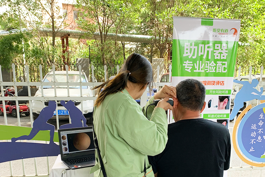 活动现场,听觉有道的验配师为大家解答听力问题,提供外耳道检查、听力筛查、测量血压、上门检测等服务,并教大家做耳保健操,指导合理用药,预防药物性耳聋……